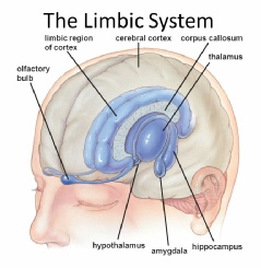 The amygdala is a structure in the limbic system that is linked to emotions and aggression. It is a small, almond shaped mass of nuclei located in the temporal lobes of the brain near the hippocampus. It functions to control fear responses, the secretion of hormones, arousal and the formation of emotional memories.